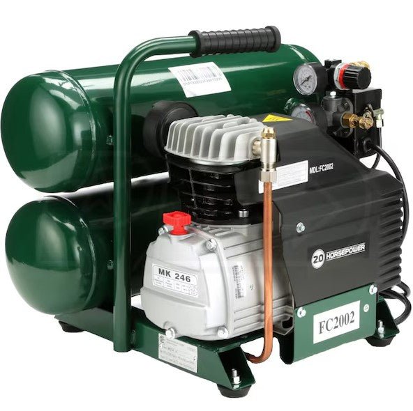 Model FC2002 features a classic stack-tank design combined with a low-amp draw, 2 HP motor for high output and consistent production. 4.1 CFM @ 90 PSI. Motor features also include manual-overload protection for longer life and ball bearings for great durability. Oversized crankcase helps hold oil viscosity longer and protects pump on unlevel surfaces.
